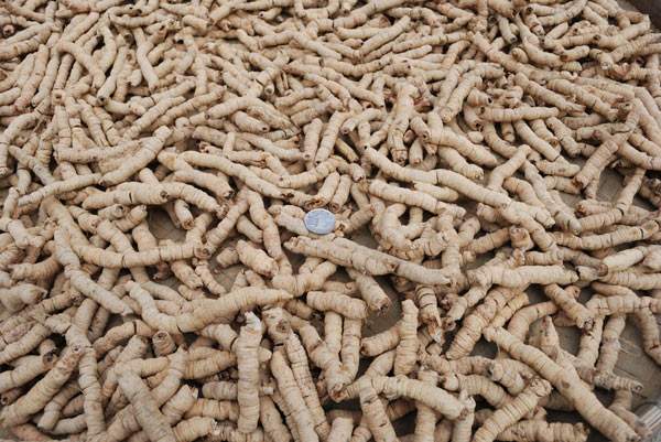 6、制巴戟天:取甘草,捣碎,加水煎汤,去渣,加入净巴戟天拌匀,照煮法将巴戟天和甘草水共煮透,趁热除去木心,切段,干燥。每100Kg巴戟天用甘草6Kg。