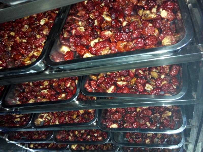 当枣内温度均匀一致,在6个小时内可完成此阶段工作。因为后期枣内水分已不多,应特别注意温度控制,切勿过大,以50℃为佳。此时相对湿度也降了下来,如高于60%时可稍加排湿。随着枣内水分逐渐平衡,也就达到干燥目的了。注意把干燥好的样品及时卸出来。